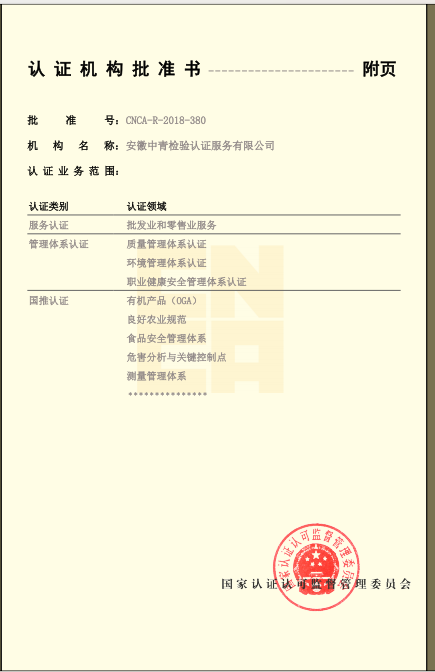 安徽省“食安安徽”品牌認證:評價是根據(jù)國際通行的合格評定方式,依據(jù)“食安安徽”品牌認證評價標準及相關規(guī)定,對申請“食安安徽”認證評價的食品生產經營者和特定區(qū)域進行的第三方認證評價活動。“食安安徽”品牌認證評價標準包括企業(yè)認證和區(qū)域評價兩大類,企業(yè)認證對象包括食用農產品生產者、食品生產企業(yè)、食品流通企業(yè)、餐飲服務企業(yè),區(qū)域評價對象包括食品生產基地、食品生產園區(qū)、餐飲安全街區(qū)、食品安全小鎮(zhèn)、安徽省食品安全示范縣(市、區(qū))。